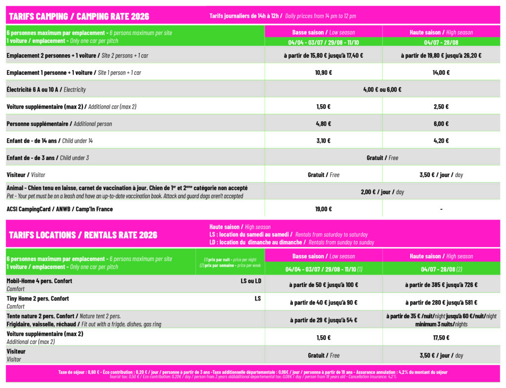 En Basse Saison : 29 €/ 2 personnes. Pour tous les amoureux...de la nature, venez vivre une expérience unique dans nos Tentes Natures "Prêtes à camper" tout confort avec leurs couettes moelleuses, leur réchaud, leur réfrigérateur et leur panier surprise pour régaler vos papilles !